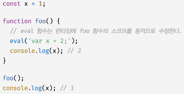 - eval 함수는 기존의 스코프를 런타임에 동적으로 수정하고 eval 함수에 전달된 코드는 이미 그 위치에 존재하던 코드처럼 동작함