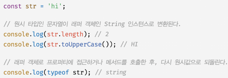 - 이는 원시값인 문자열, 숫자, 불리언의 값의 경우 이들 원시값에 대해 마치 객체처럼 마침표 표기법으로 접근하면 자바스크립트 엔진이 일시적으로 원시값을 연관된 객체로 변환해주기 때문